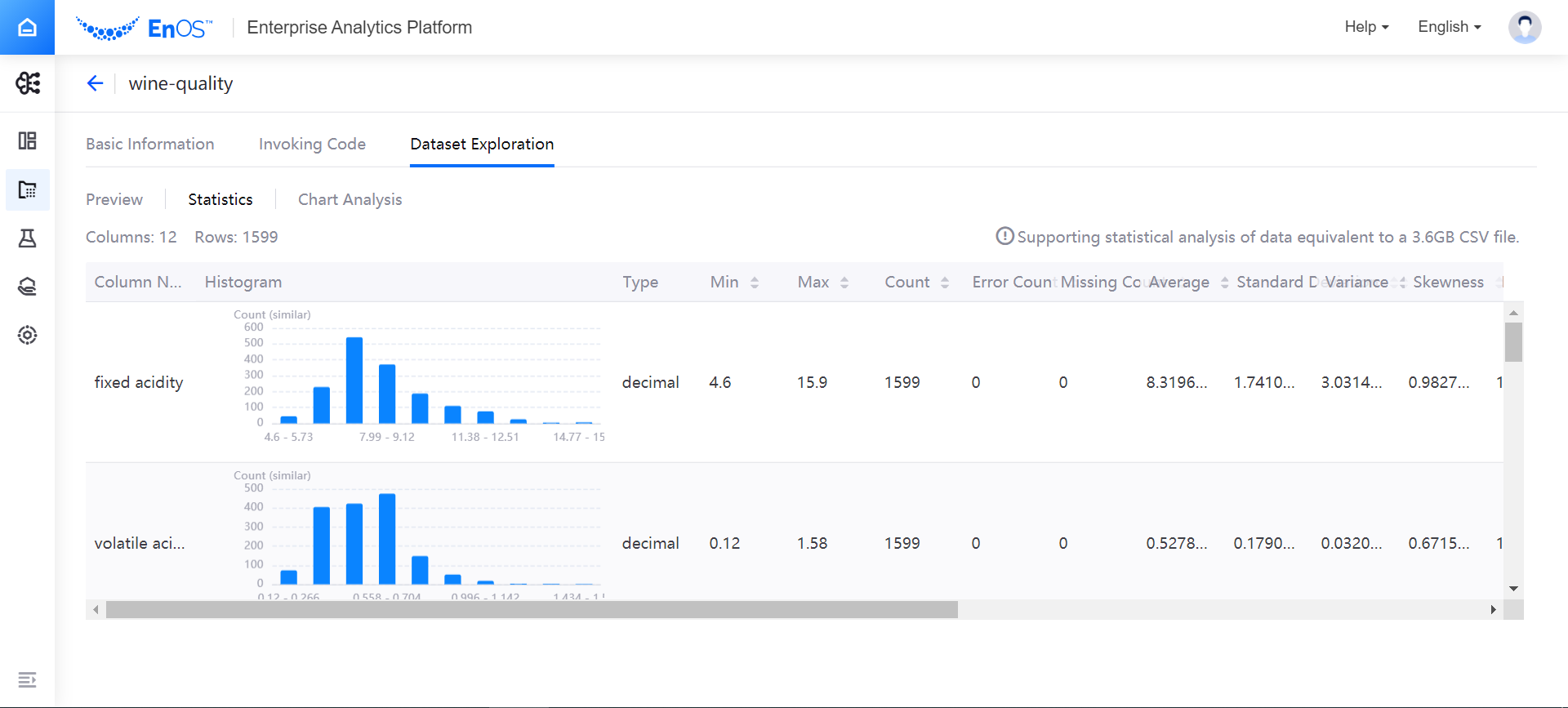 The statistical analysis results show the count of dataset columns and rows, and statistics of each column. The statistical analysis supports analysis of data equivalent to a 3.6GB CSV file. See the following example: