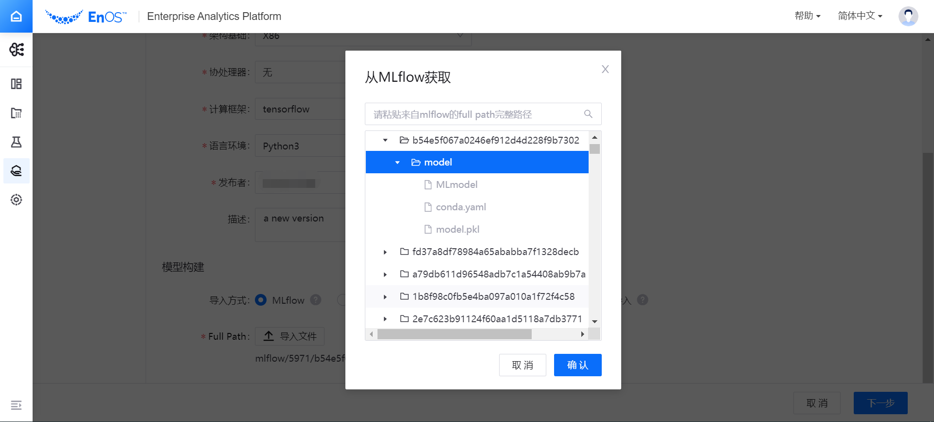 • Full Path 一栏中,选择 导入文件。弹窗中将显示通过智能实验室训练任务生成的 Artifacts 文件。有关通过 MLflow 查看模型构建文件的详细信息,参考 查看实例运行结果