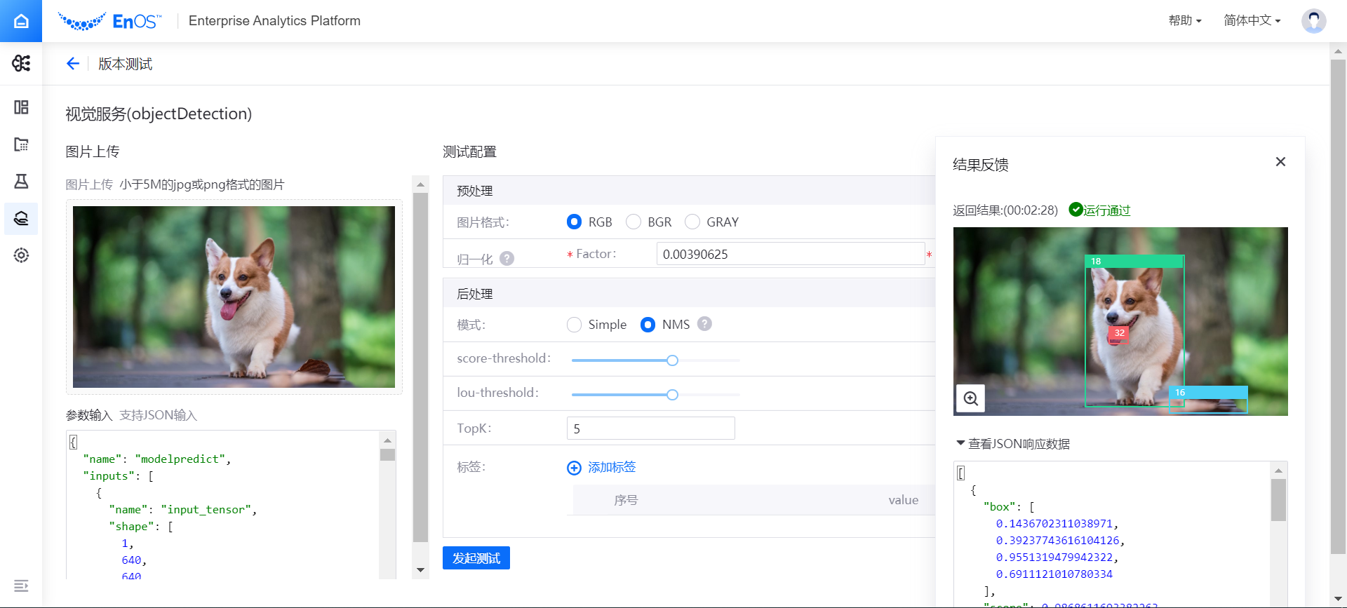 4. 选择 发起测试,系统将根据测试配置信息开始运行模型版本测试。在 结果反馈 栏中,查看测试返回结果和 JSON 响应数据。