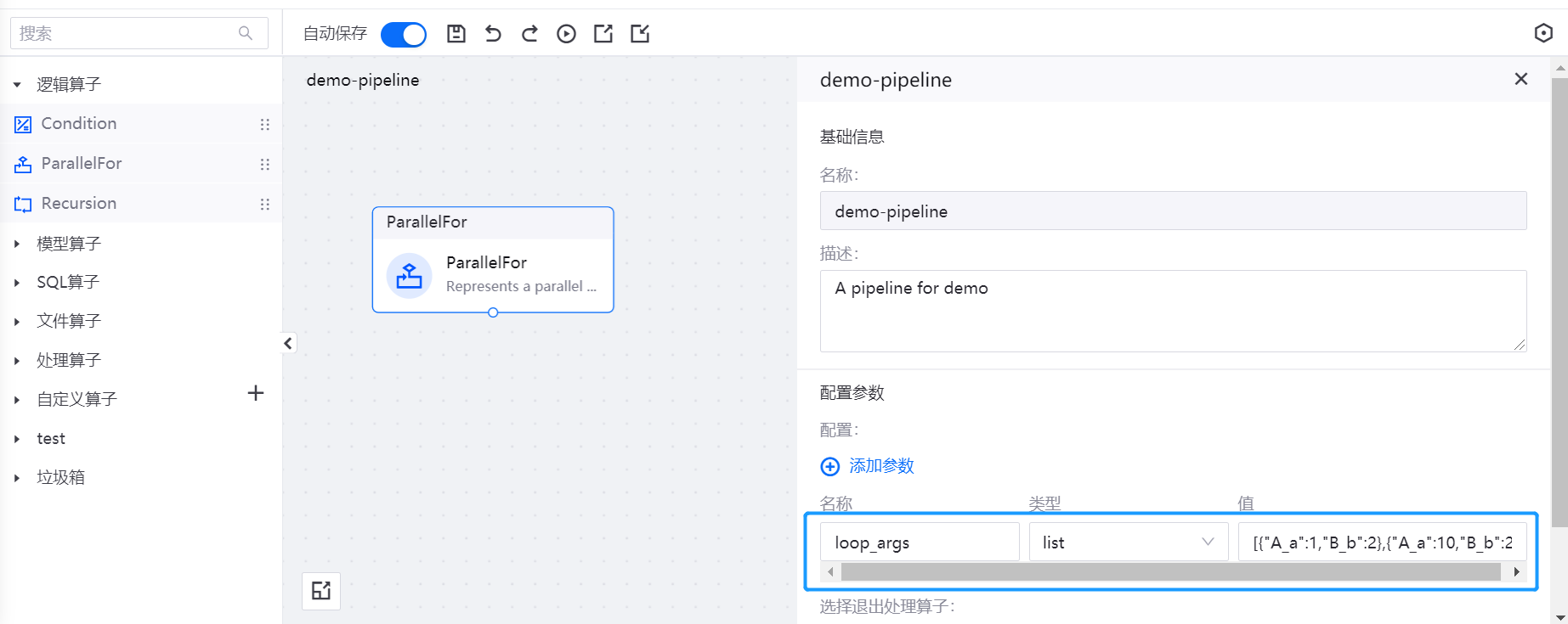 选中 ParallelFor 算子,在其参数配置的 输入参数 项中,引用参数