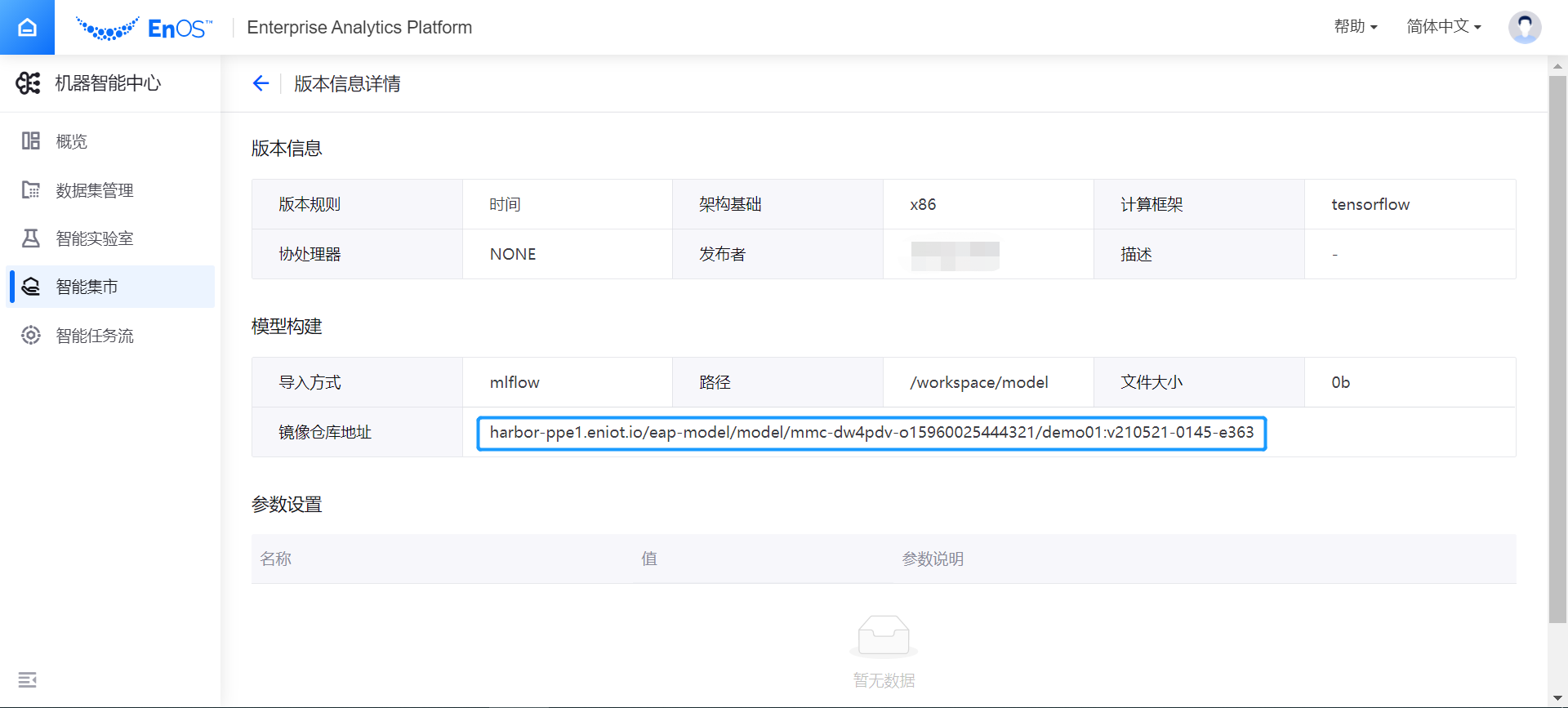 • 已在智能集市中完成模型版本上架,并通过 版本信息详情 页面获取镜像仓库地址,如下图所示: