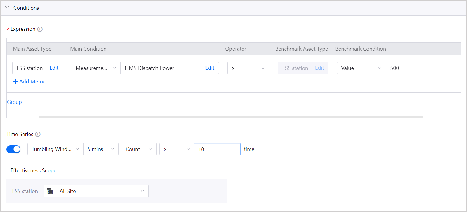 ∈[min,max]as Operator,Measurement Pointof a certain device’s voltage as Main Condition, and the minimum threshold10and maximum threshold35as Benchmark Condition , then when the voltage of the device exceeds the range [10,35], the alarm rule will be triggeredIf you choose to enable the time series function, and set the frequency of