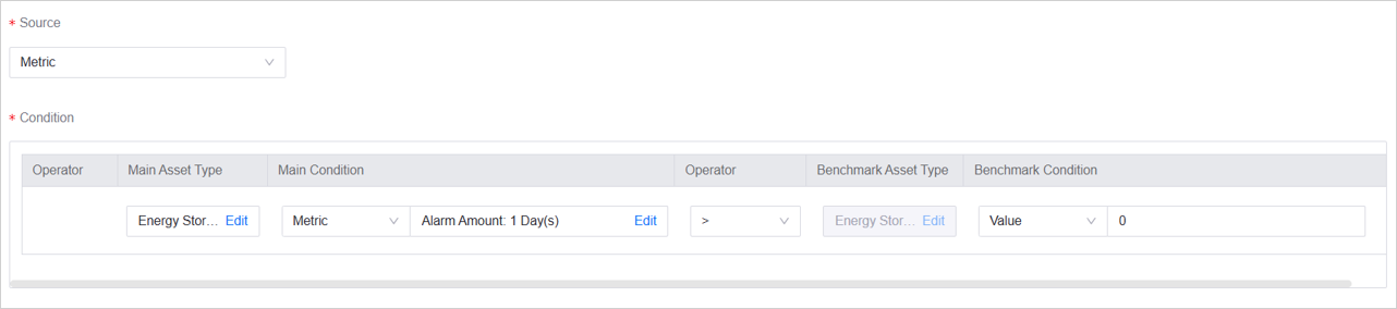 Primary Metric: A general metric, such as “Power Generation”. When used as an alarm condition, you need to specify a time interval, which defines the period for data aggregation, and the aggregation result serves as the main condition. For example, “1 Day” means aggregating data daily, and “Total” means aggregating all available data within the time range. If left empty, the time interval is unrestricted and each metric data point will be calculated.