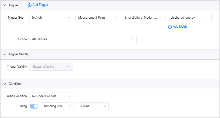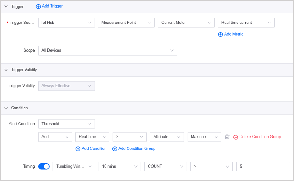 For example, a current meter will trigger an alert if its real-time current exceeds the maximum current allowed, yet the user does not want to receive alerts every time it exceeds, but only when it exceeds the maximum current 5 times within a 10 minute time frame. The user can then choose the real-time current measurement point as Trigger in the Trigger Settings, set the alert condition threshold, and configure the Timing.