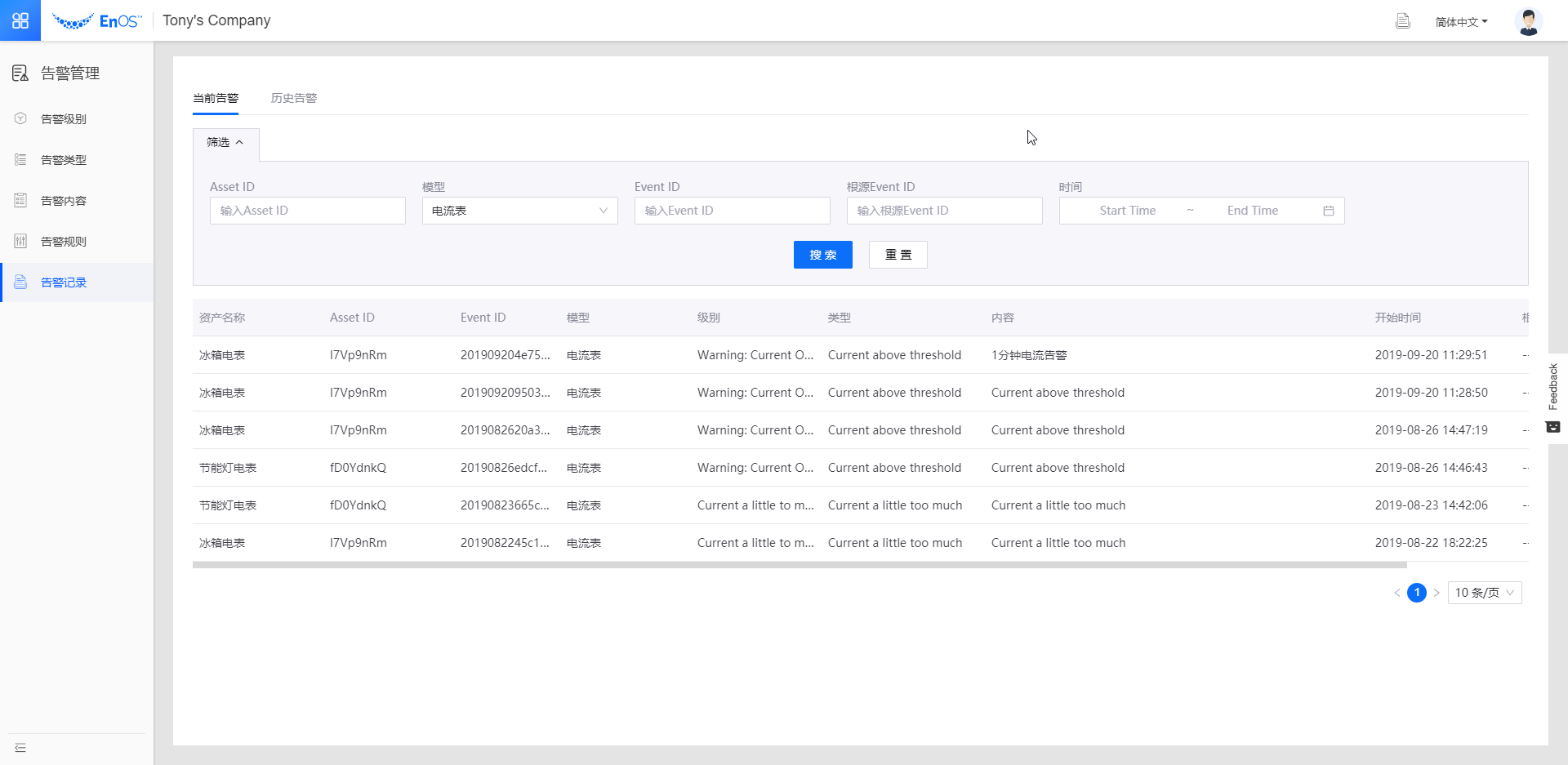 选择 告警管理 > 告警记录 ,将 模型 设置为 电流表 ,点击 搜索 。