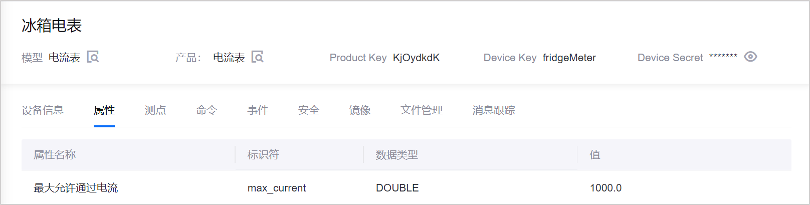 创建设备实例的步骤,参见 注册设备。在本场景中,我们需要创建两个设备实例,分别代表测量冰箱和节能灯的电流表。其必要信息如下: