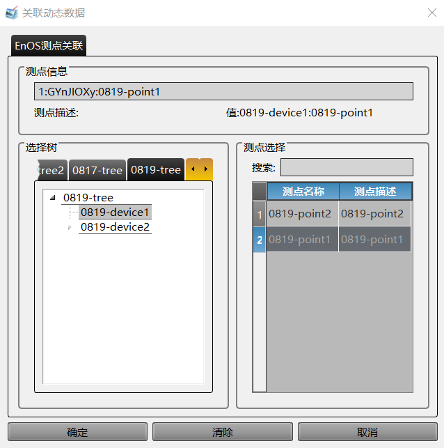 在弹出的窗口中选择需要关联的资产树、资产、和测点。点击 确定。如下图所示: