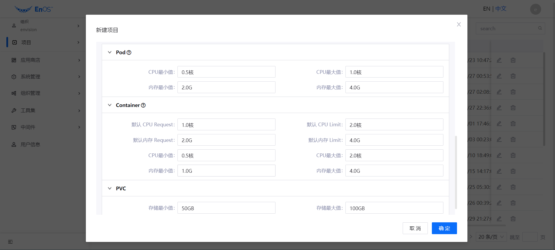 4. 为生效集群配置项目占用的资源配额,包括 CPU 和内存的最小值和最大值、Storage 限额、以及 Pod 数量。更多关于资源配额介绍,参见 资源配额