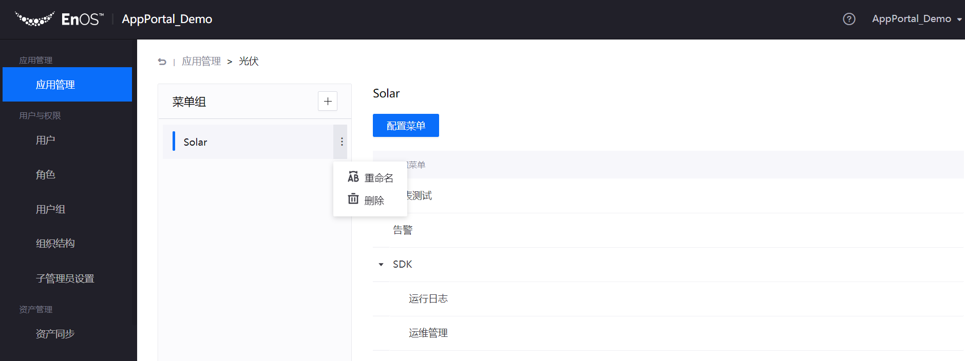 通过管理应用菜单组,可配置应用中需要展示的菜单结构和组合。