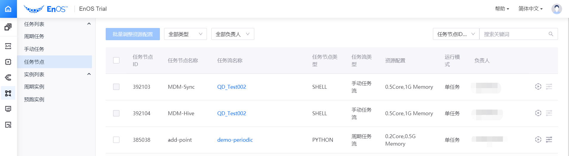 登录 EnOS 管理控制台,选择 任务流运维 > 任务节点,可通过节点任务类型或任务负责人筛选任务节点,或通过任务节点ID或名称搜索任务节点。