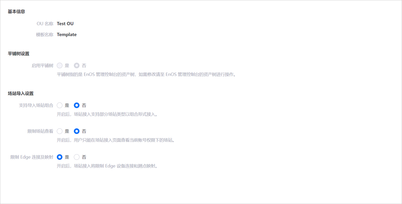 限制 Edge 连接及映射:若启用该功能,在 接入工具 > 场站接入 页面将不展示 配置连接 和 映射测点 步骤,无法在接入工具通过 EnOS Edge 网关将设备连接到 EnOS,并映射测点。