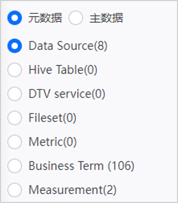 2. 数据资产检索 功能首页右侧的元数据对象统计标题下,点击需搜索的数据类型括号内的数字,跳转到 数据资产检索 功能主页面。