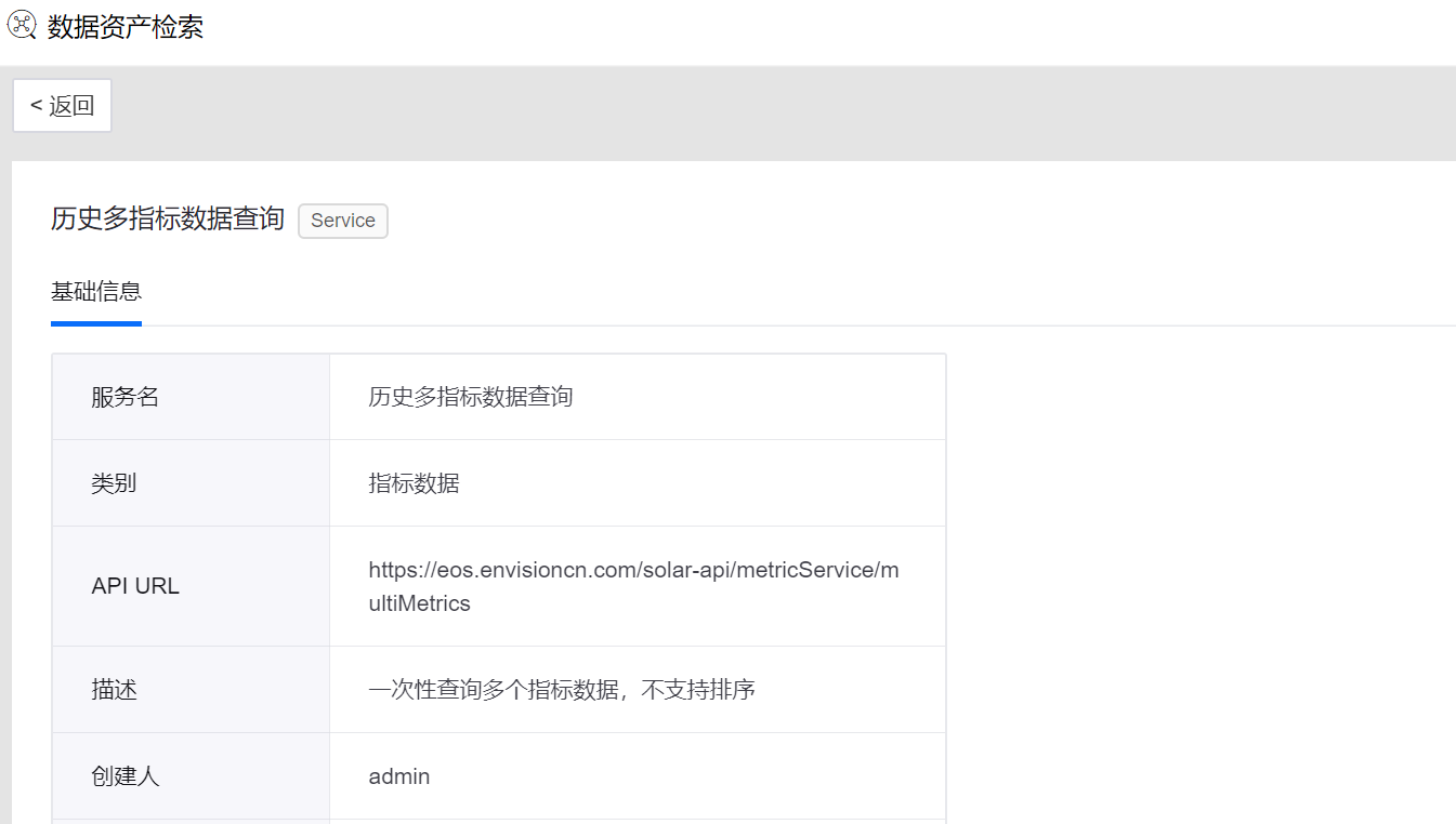 在服务查询结果列表中,点击 查看 按钮,打开检索详情页,查看服务元数据信息: