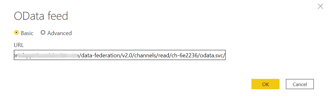 In the pop-up window, select Basic, enter the OData URL that was copied in step 1 in the URL field, and click OK.