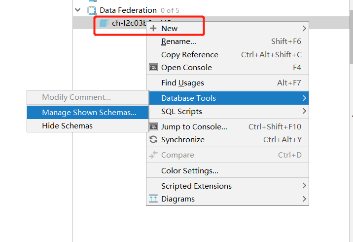 在 Catalog 上点击右键,选择 Database Tools > Manage Shown Schemas,然后选择 All schemas,展示所有的schema: