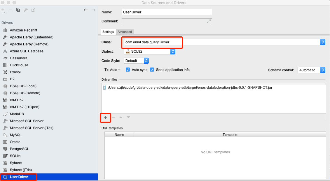 输入 Driver 名称、class 名称,并在 Driver files 中添加在步骤1中下载的jar包,如下图所示: