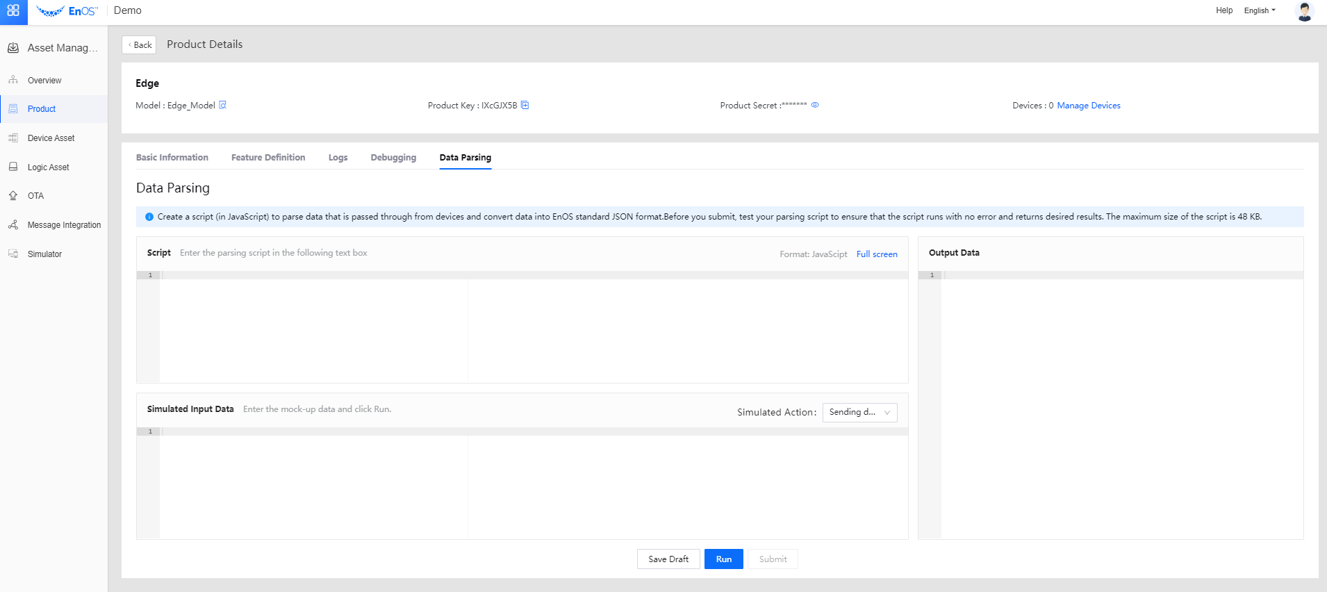 When creating a product, if you select Custom for the Data Type field, the device can send data in any format (for example, binary data) to the EnOS Cloud. If this is the case, you will need to create data parsing scripts to encode and decode the upstream and downstream data. This topic describes how to edit and debug the script in the EnOS Cloud, and how to upload it to the EnOS runtime environment.