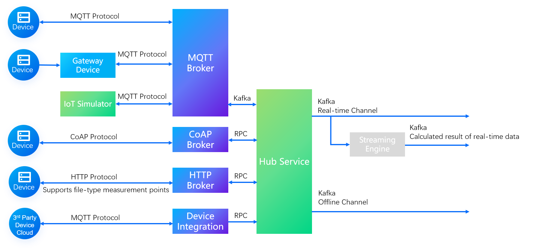 The IoT Hub supports the integration of historical messages from third-party systems over MQTT, and the integration of real-time messages from third-party systems over HTTP.