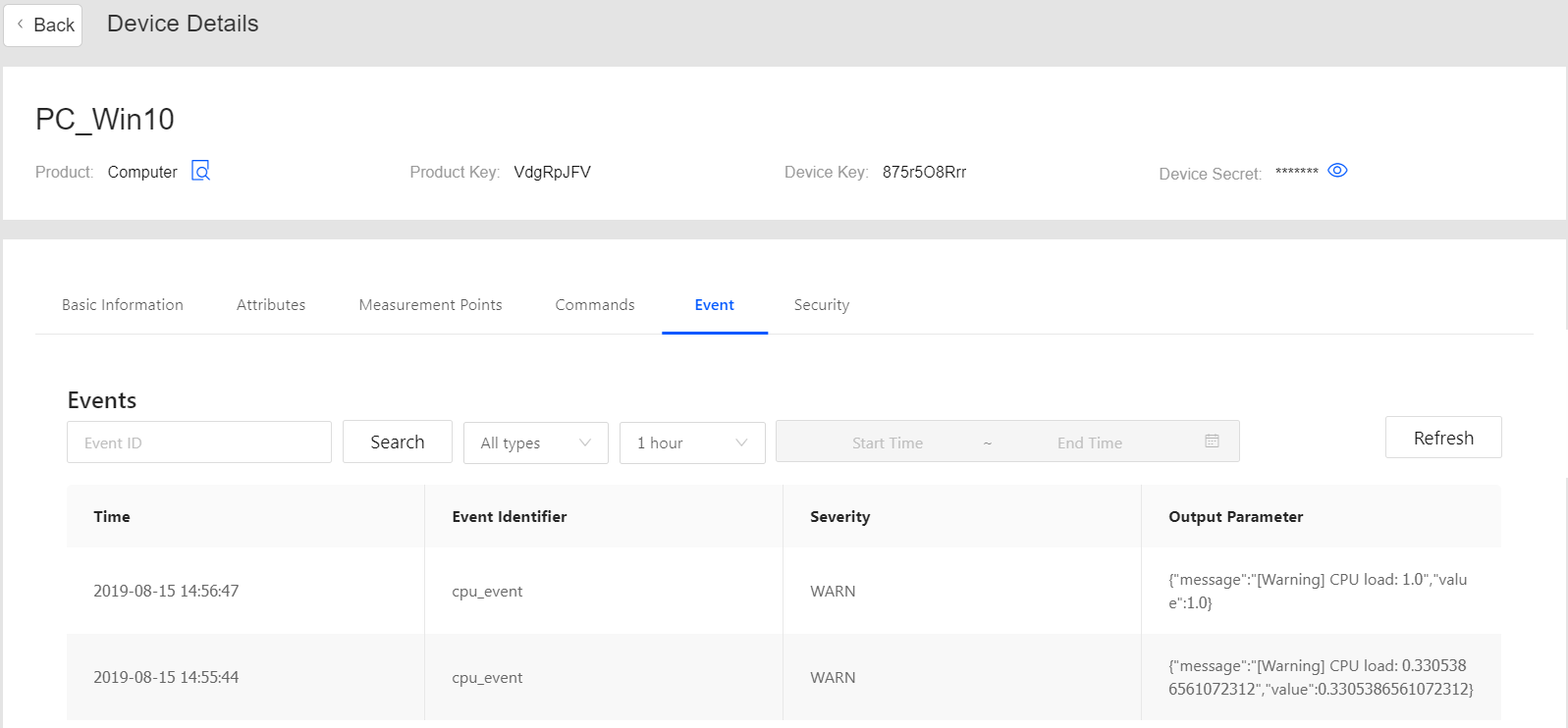 reportCPULoadEvent()function to report the CPU load events if the CPU load exceeds the threshold.public static void reportCPULoadEvent(double value, String describe) { EventPostRequest request=EventPostRequest.builder() .setQos(0) .setEventIdentifier("cpu_event") .addValue("value", value) .addValue("message", describe) .build(); System.out.println(">>> Post Event: "+request); try { EventPostResponse resp = client.publish(request); System.out.println("<-- " + resp); } catch (Exception e) { e.printStackTrace(); } }