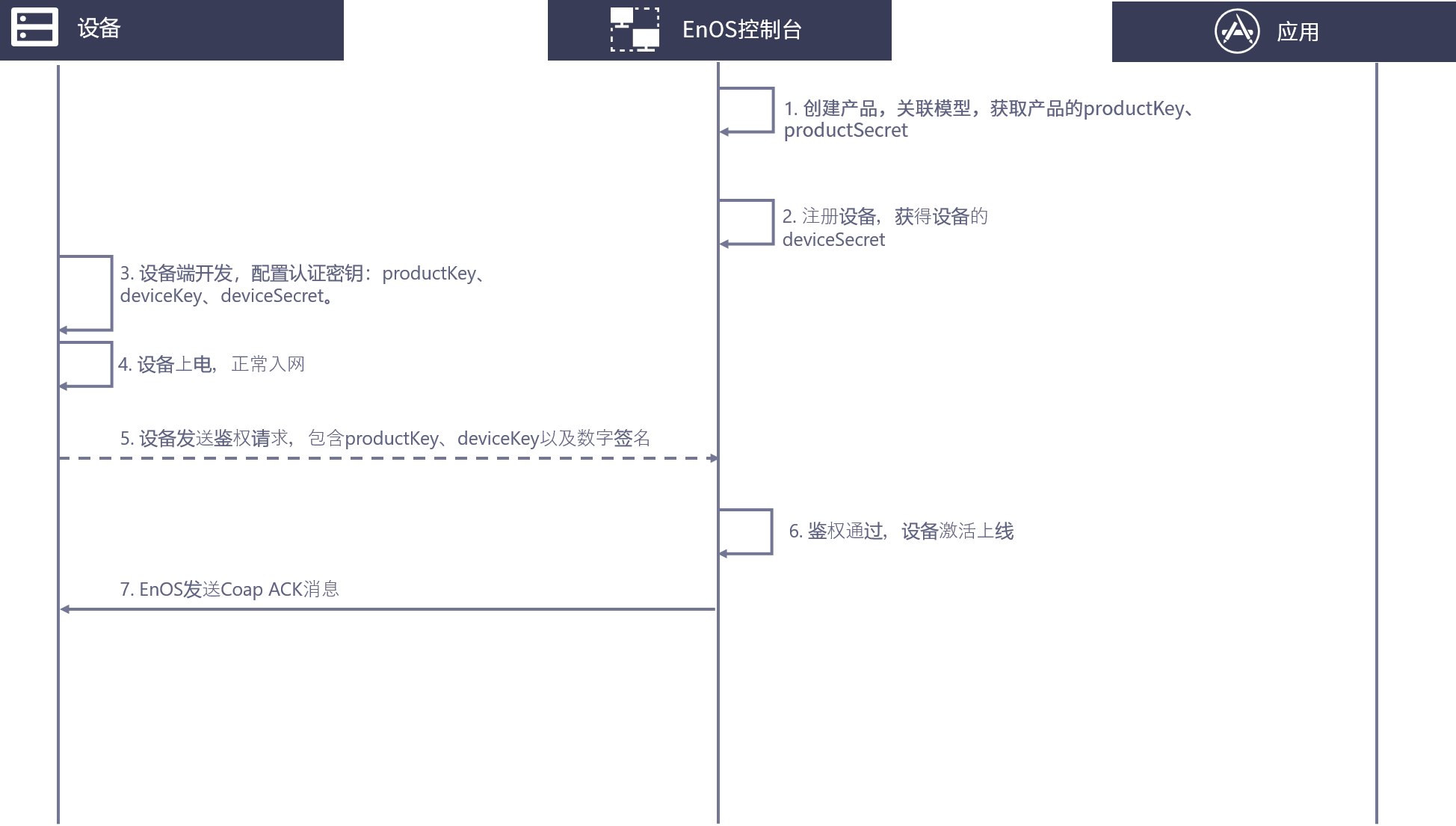 5. 设备向EnOS发送鉴权请求,请求中包含了认证密钥productKey、deviceKey、deviceSecret以及数字签名。
