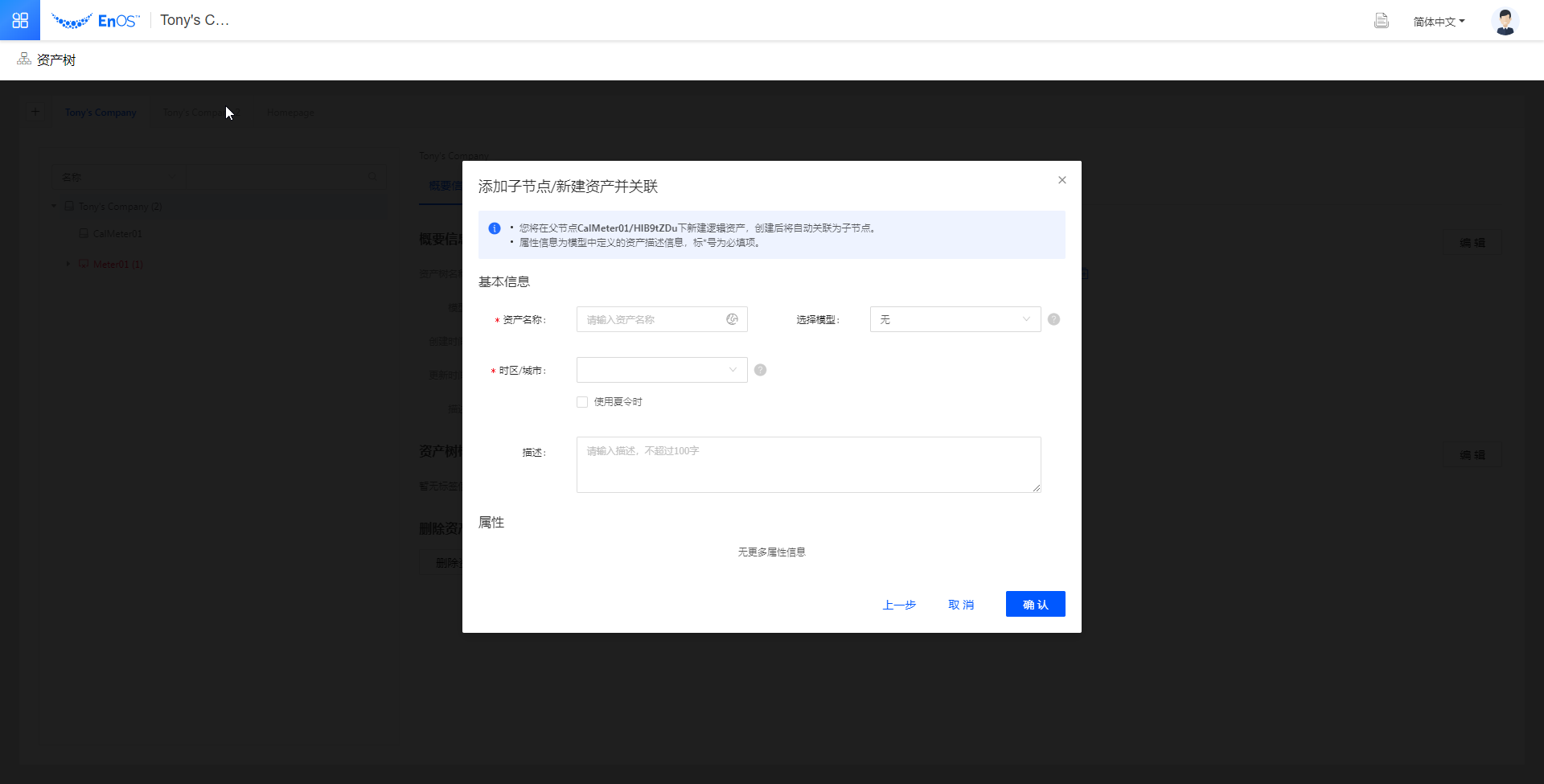 3. 输入资产名称,选择设备模型,并指定该设备所在时区或城市、添加描述。
