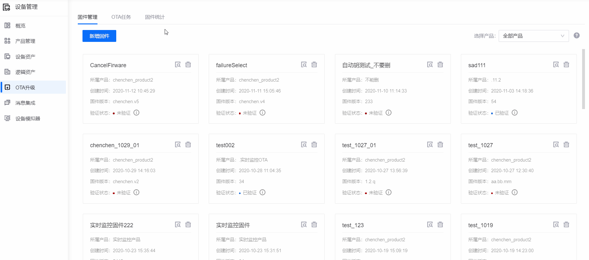 登录 EnOS 管理控制台,选择 设备管理 > OTA升级 > 固件统计。