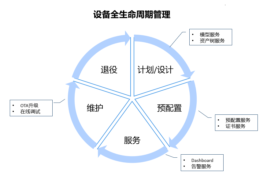 下图展示了 EnOS设备连接与管理产品在设备生命周期各阶段提供的服务: