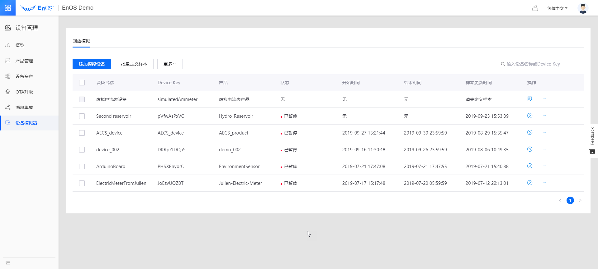 设备模拟器让你能够在不使用EnOS Java SDK的情况下,模拟一个在EnOS注册了的设备发送数据至EnOS,以便熟悉EnOS各项功能、或调试故障。使用Java SDK模拟设备接入EnOS的教程,参见Connecting a Simulated Device into EnOS。