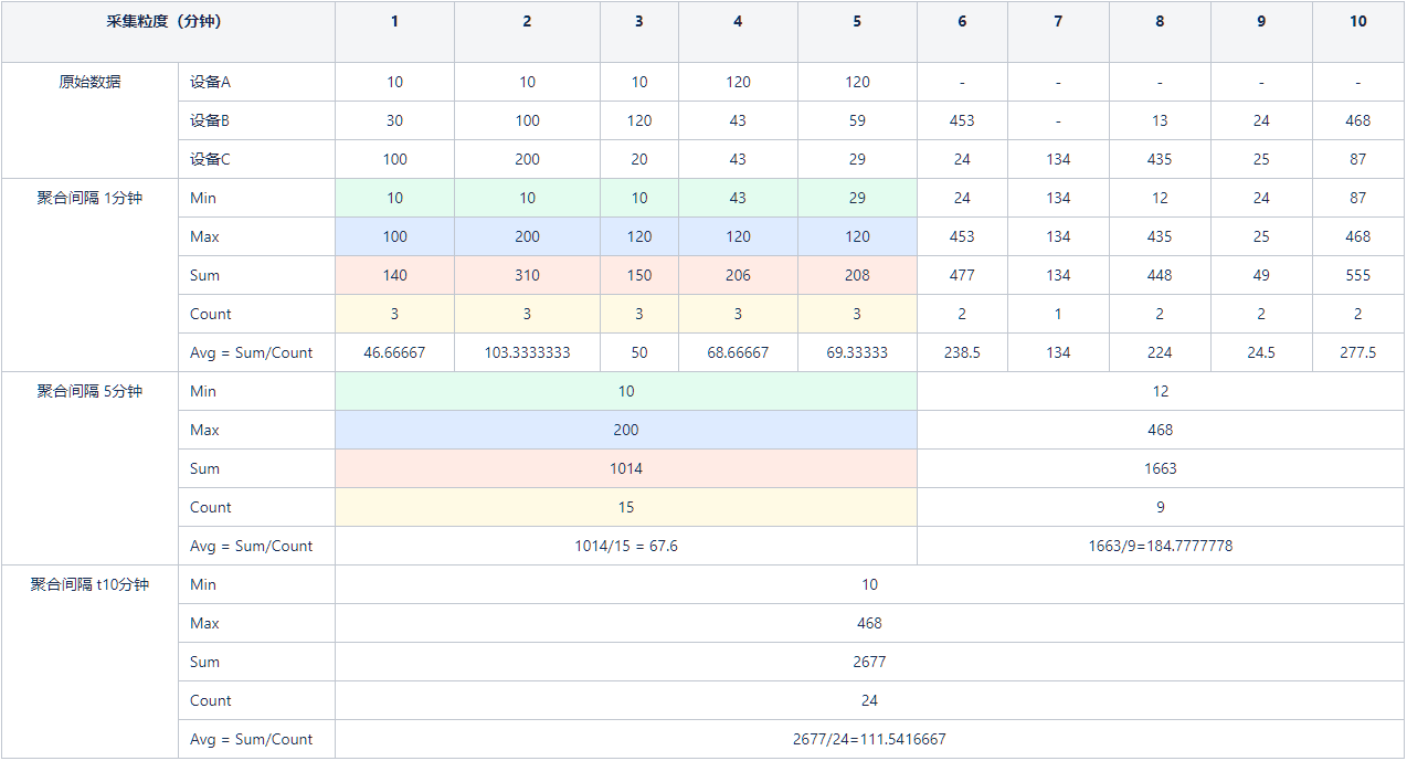 假设每分钟采集一次设备 A、B、C 的原始数据并进行相应聚合操作,具体的数据如下图所示: