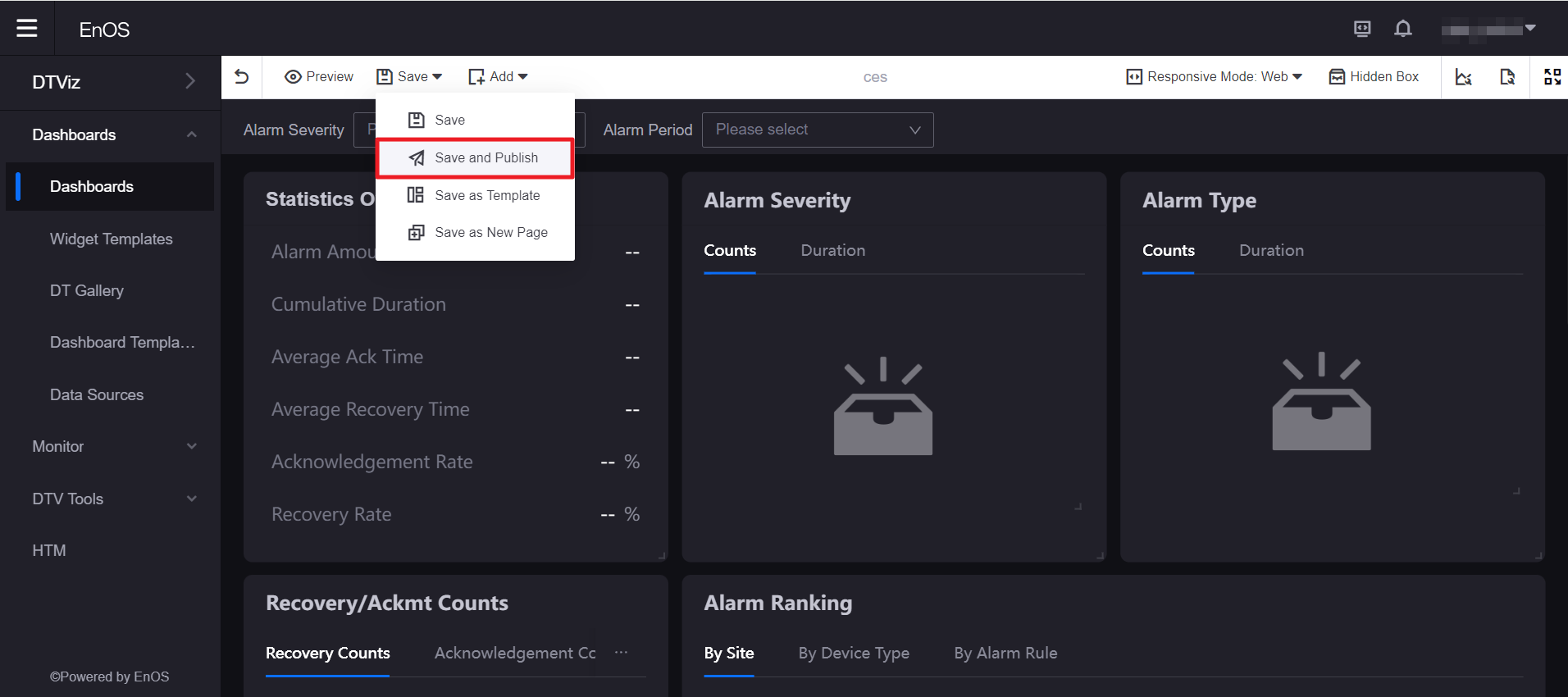 DTV organizes visualization widgets through dashboard pages. Create a dashboard to display visualization widgets and asset data with the following steps: