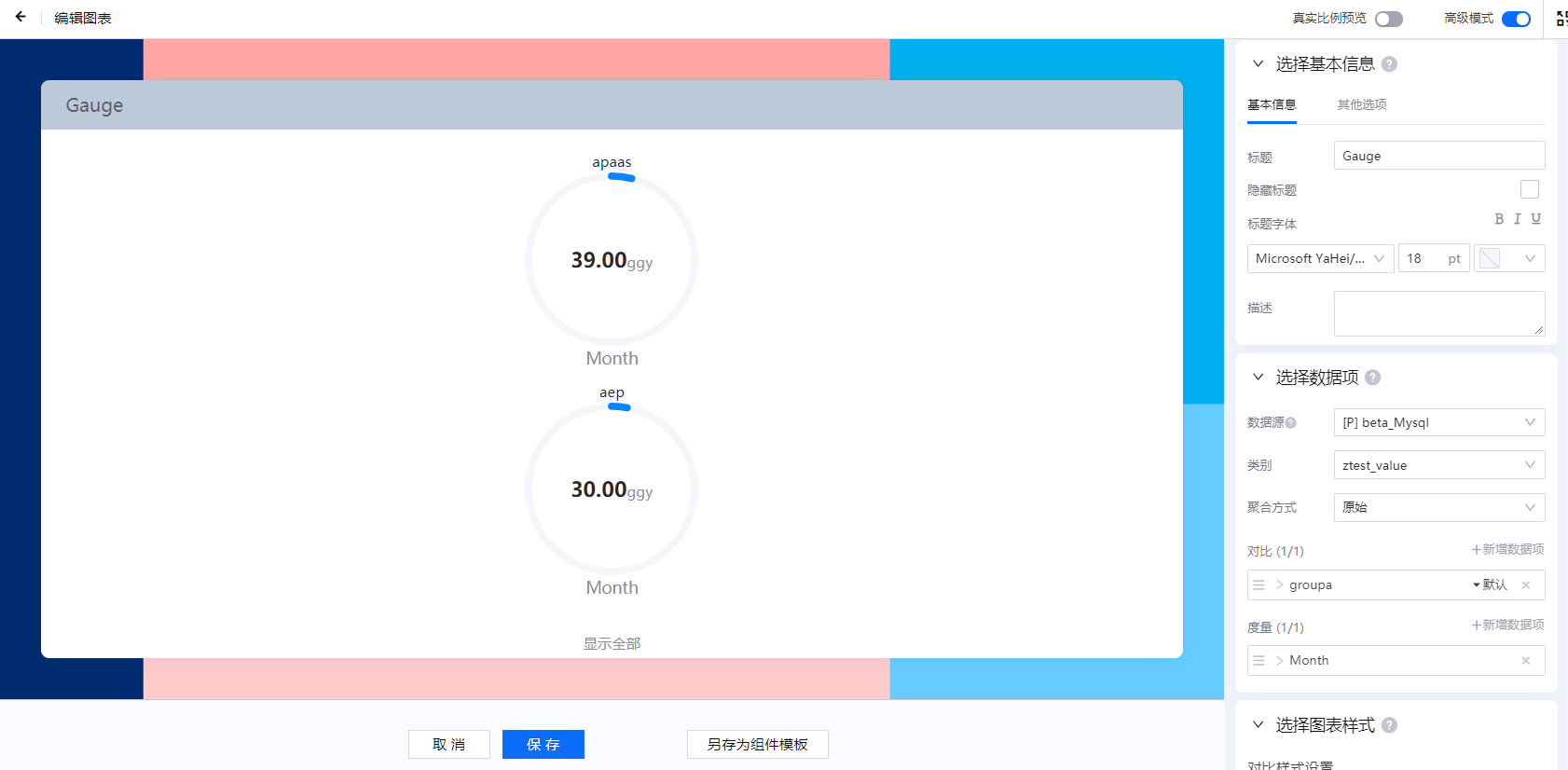 数字表盘组件的配置项主要包括 基本信息、数据项、和 图表样式。