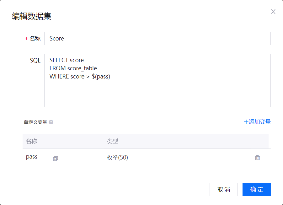 可以将自定义变量传递给为数据联邦数据集指定的 SQL 查询。这可用于执行类似的查询,而无需创建重复的数据集和 SQL 查询。