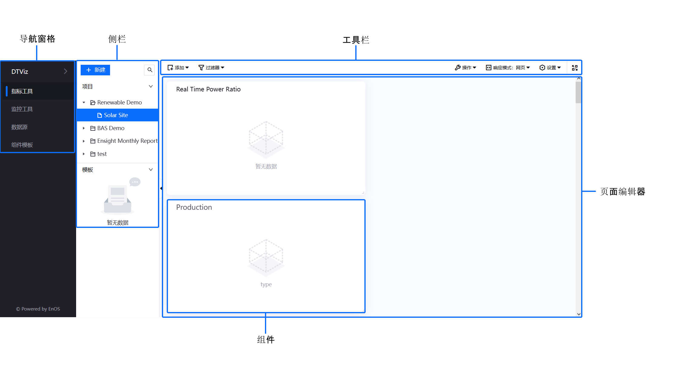 页面编辑器 可用于创建组件,按照需求排布组件,并发布为最终的可视化视图供用户查看。