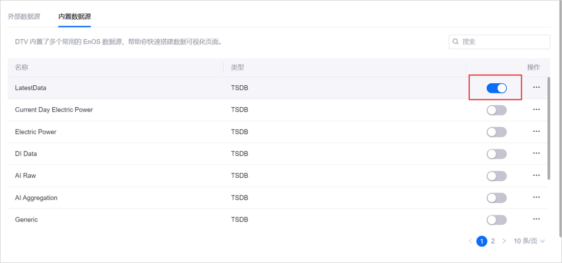 在应用门户的 DTV 中心 > 数据源 > 内置数据源 中,启用 LatestData 数据源: