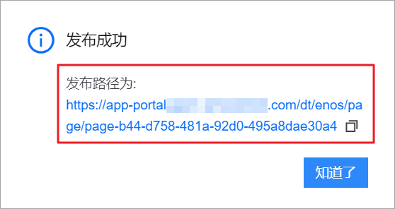 在配置完成页面配置后,需要发布页面并获取页面 URL,以便后续将此页面集成到应用菜单中。