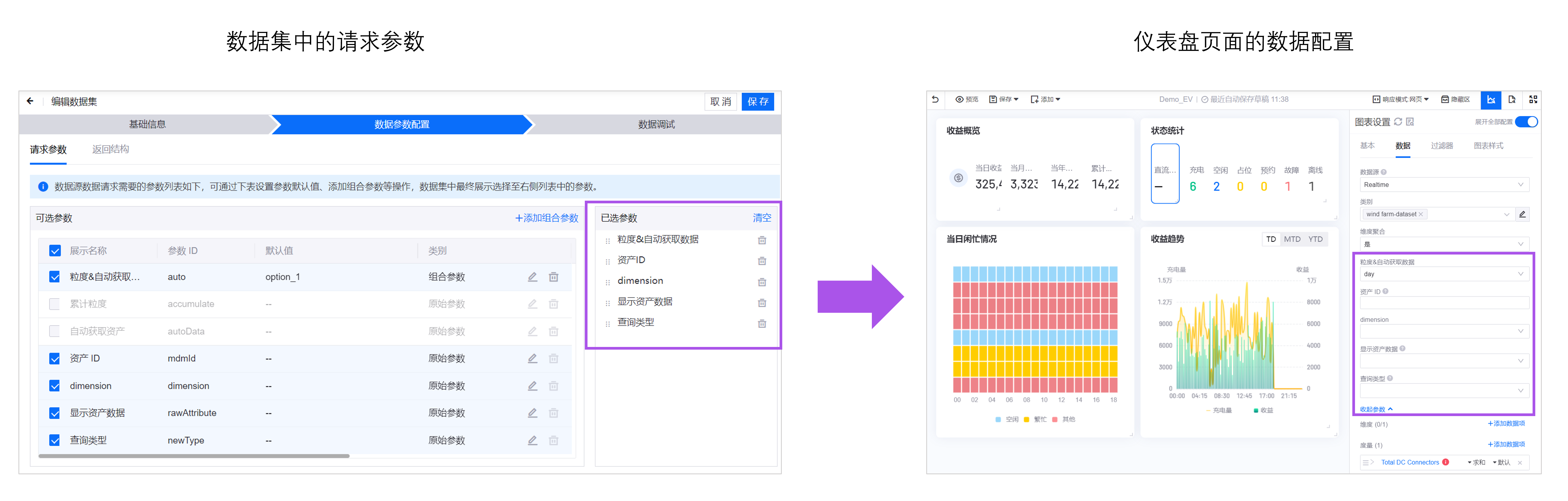 请求参数是页面的组件在请求数据时向数据源发送的参数。创建数据集后,需要为数据集定义请求参数。例如,为仪表盘组件选择数据集后,需为组件配置已选的请求参数的值。