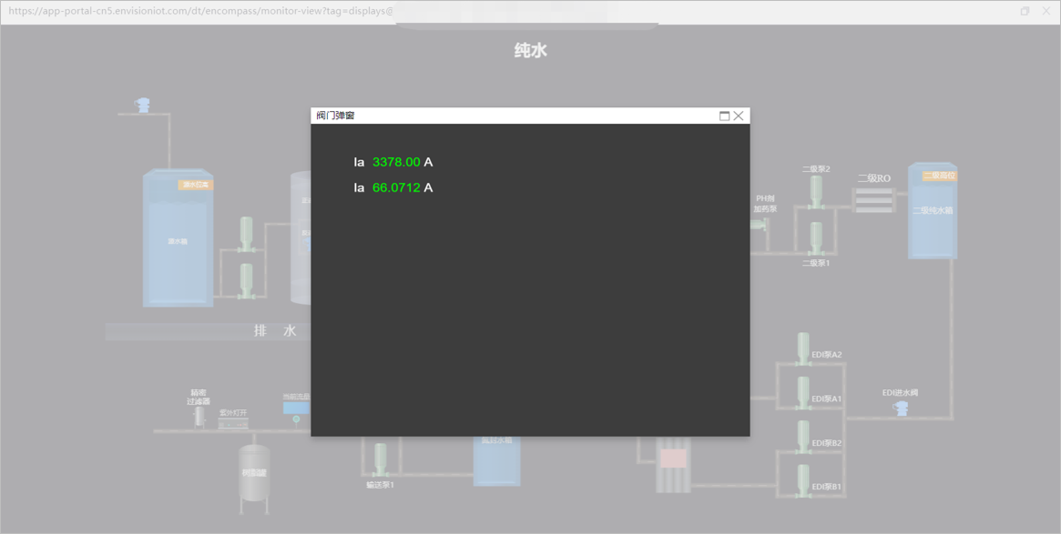 组态页面常用于构建设备运行状况的实时组态页面。本教程以纯水净化系统的智能监控为示例场景,实现氮封水箱液位、碳罐阀门开关状态及高压泵进水阀的交互跳转等设备数据的实时监控。