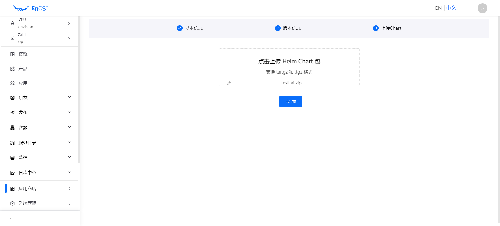 点击 下一步,在 上传Chart 页中,选择待上传的应用模板 Chart 包后,点击 完成,即可完成新增应用模板。