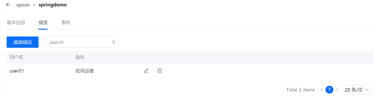 在 成员 标签下,可添加应用成员、搜索成员、更新现有成员信息、或移除成员。