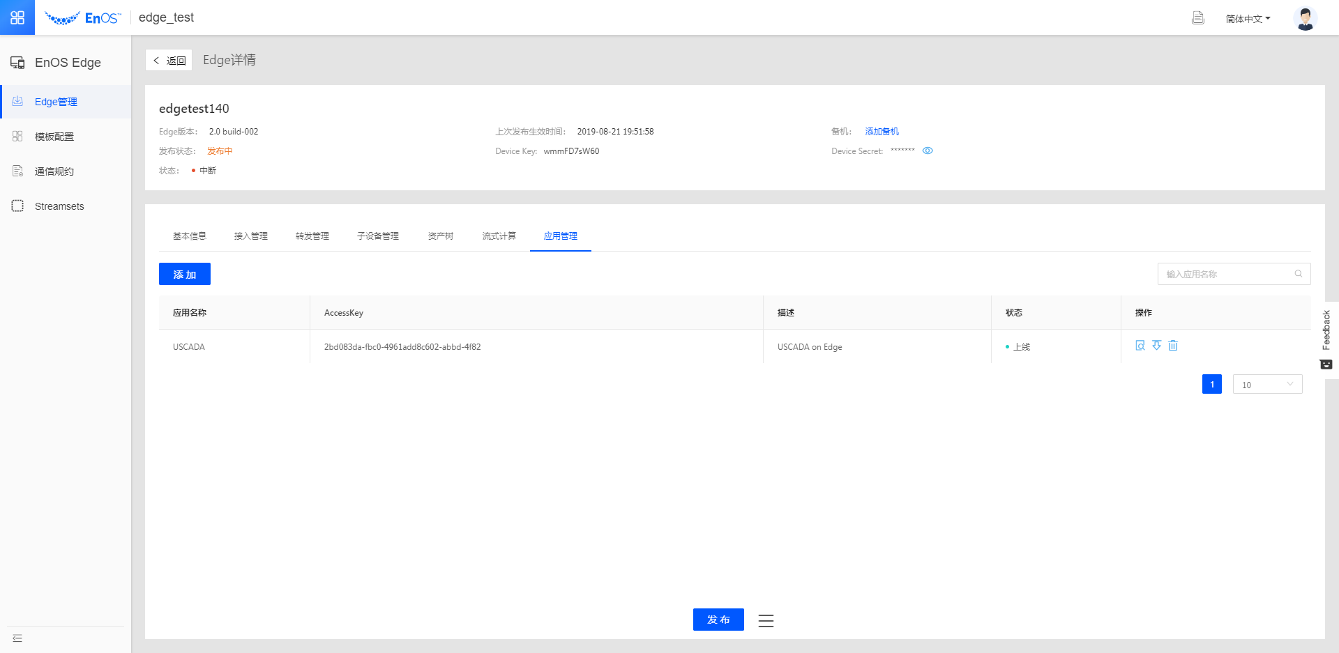 应用上线后,需要点击 发布 按钮,将云端配置好的Edge信息,发布到Edge当中去,应用的上线才会生效。
