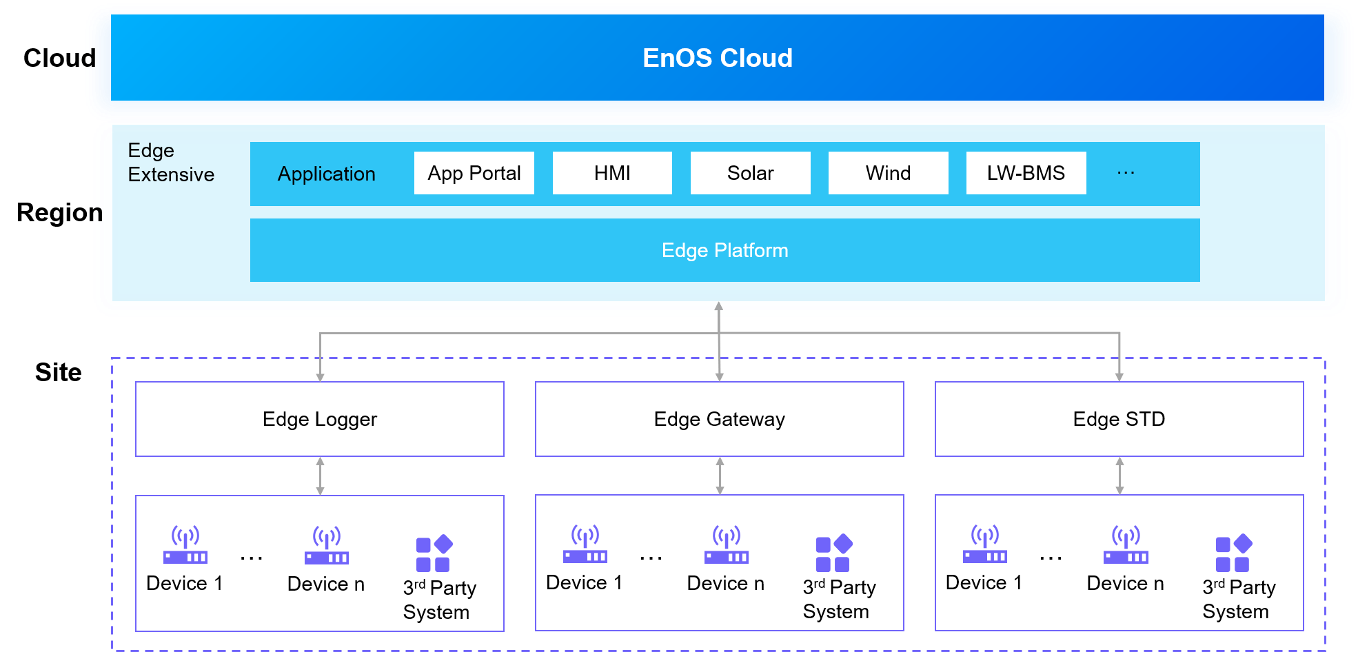 在小型区域中心部署Edge STD或Edge Extensive,使用以太网连接Edge Logger、Edge Gateway、Edge STD、第三方系统或设备,并通过防火墙与云端建立VPN链路进行通讯。