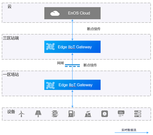 为了将一区Edge采集的设备数据上送到云端,EnOS Edge 提供边缘级联功能。在满足工业标准合规性要求的基础上,同时保持了开放互联的能力。每层 Edge 设备可以实现边缘计算以满足其自身的业务需求,同时为上层提供聚合、筛选、分析等互操作性服务。例如:最下级Edge采集电力一区的设备数据,并转发给上级Edge,通过上级Edge的中继作用,将数据上送到云端,功能架构如下图所示:
