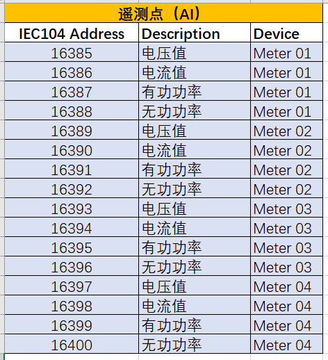 4. 下载原始设备点表 Original_Point_Info.xlsx,双击并打开文件。如下图所示,每个电表都有相同的 4 个测点数据需要采集,分别为电压值、电流值、有功功率和无功功率,因此这一批设备能够共用一个接入模板进行映射。