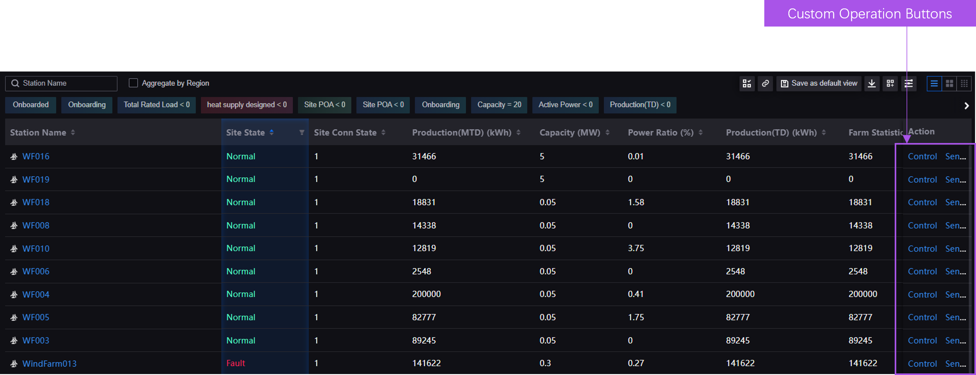 Total row can be used to summarize the data in an entire column. For example, in the device list of wind scenario, the total row can be enabled if you need to sum up the production of all turbines.
