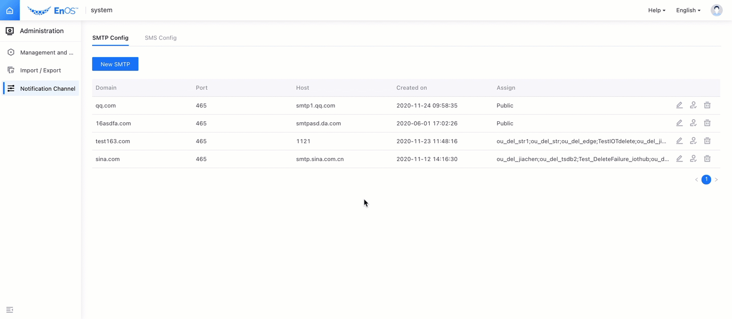 Log in to the EnOS Application Portal > Developer Console as the system administrator, select Notification Management > Administration > Notification Channel > SMTP Config, and click New SMTP.