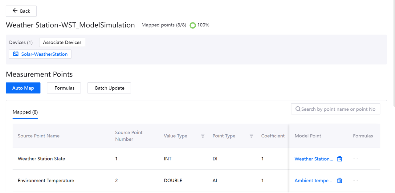 Mapping measurement points means to map the source measurement points of the weather station device to the measuring points of EnOS Cloud models. By importing the source point table and configuring the logical addresses and offsets, the measurement point mapping is realized. After mapping, EnOS Cloud will be able to produce accurate analysis, real-time alarms, and forecasts fsrom the data uploaded by the device. For more information, see Mapping Points.