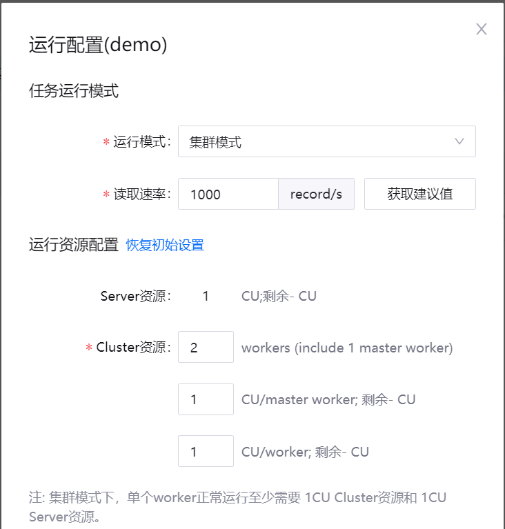 4. 如以集群模式运行流数据处理任务,从 运行模式 下拉菜单中,选择 集群模式,输入读取数据的速率,然后配置运行任务所需的集群资源。