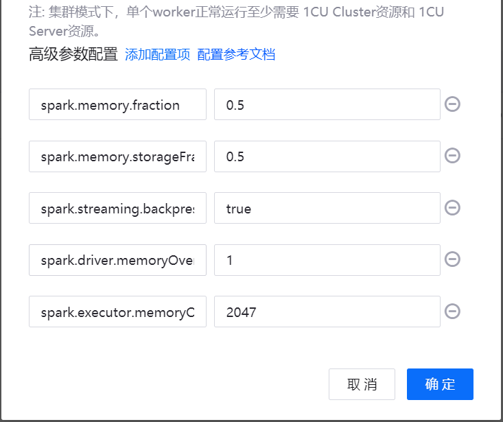 5. 如需配置集群模式高级参数,点击 添加配置项,并输入需要使用的参数和对应的值。对可配置的高级参数的说明,参见 集群模式高级参数