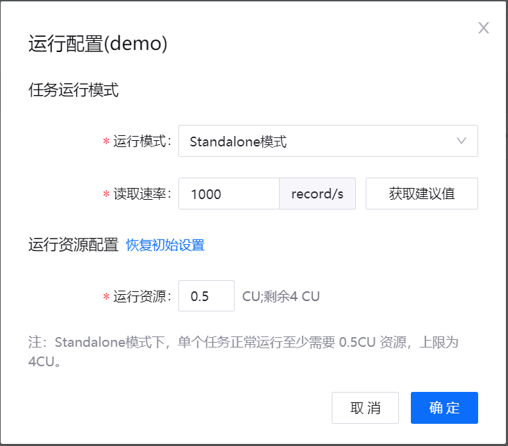 3. 如以单机模式运行流数据处理任务,从 运行模式 下拉菜单中,选择 Standalone模式,输入读取数据的速率,然后输入运行任务所需的资源(CU数量)。