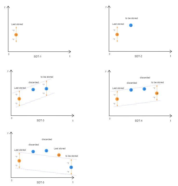 3. 数据点3到达时,在数据点1和数据点3之间形成一条直线,并按照△y上下平移形成两条上下边界。判断数据点2是否在此上下边界内。如果数据点2在边界内,则丢弃该数据点。